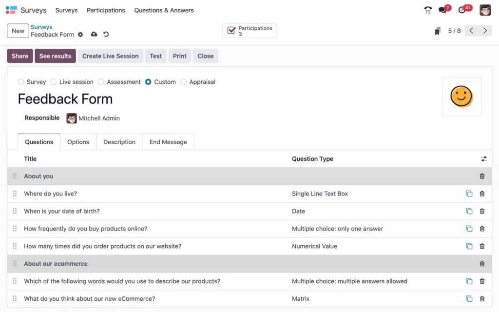 Daten ermöglichen fundierte und gut begründete Entscheidungen, wenn sie richtig genutzt werden. Mit dem Odoo-Umfragetool können Sie Kundenzufriedenheitsbefragungen erstellen, um ein genaueres Bild der Stärken und Schwächen Ihrer verkauften Produkte zu erhalten. Erstellen Sie Ihre Fragen und gestalten Sie sie ganz einfach mit dem Odoo-Umfragetool. Verwenden Sie auch intern Zufriedenheits- oder Bewertungsformulare und sammeln Sie die Anmerkungen oder Meinungen Ihrer Mitarbeiter. So erhalten Sie Echtzeitdaten zu den verschiedenen Bereichen, die Sie untersuchen.