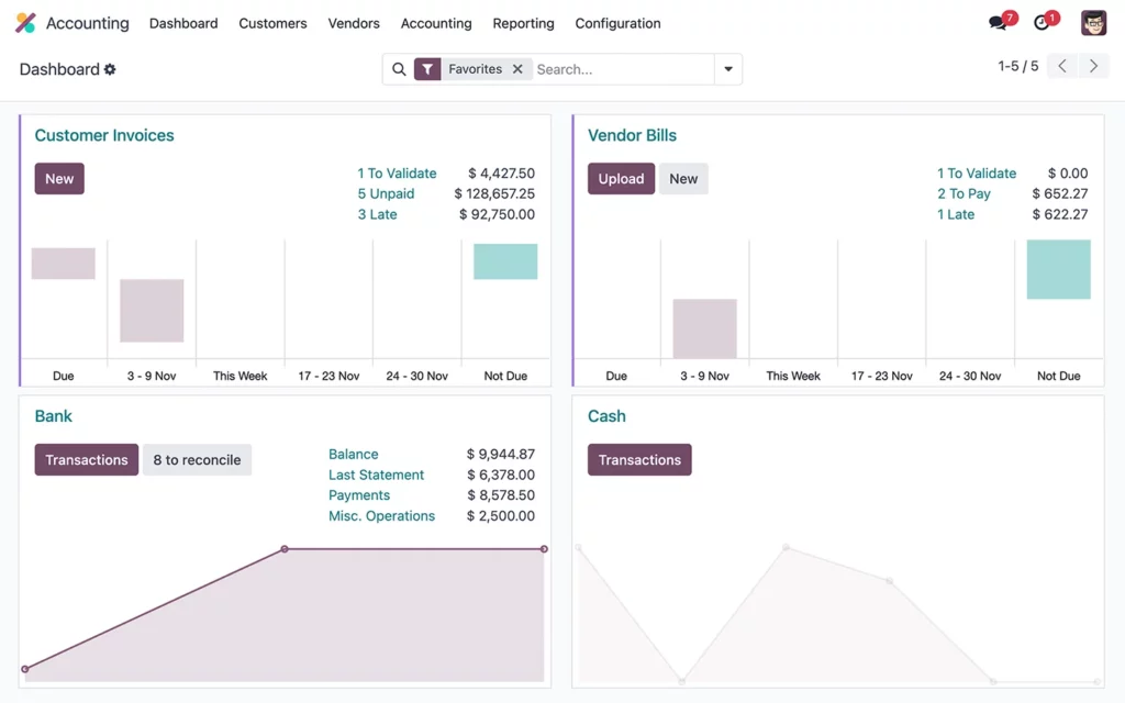 Plus besoin de saisir les données manuellement pour remplir vos documents, elles se remplissent automatiquement depuis votre carnet d’adresse. Vous gagnerez ainsi un précieux temps dans le traitement des factures, des payements et des pièces comptables notamment grâce à la synchronisation des relevés bancaires ou à l’importation de fichiers externes. De plus, vous pouvez aussi scanner vos documents depuis un appareil mobile, l’intelligence artificielle intégrée fera de ce scan un document comme si vous l’aviez rempli manuellement dans Odoo. Des rapports de performance financière sont disponibles en temps réel ; ils permettent d’accéder à des informations utiles facilement.
