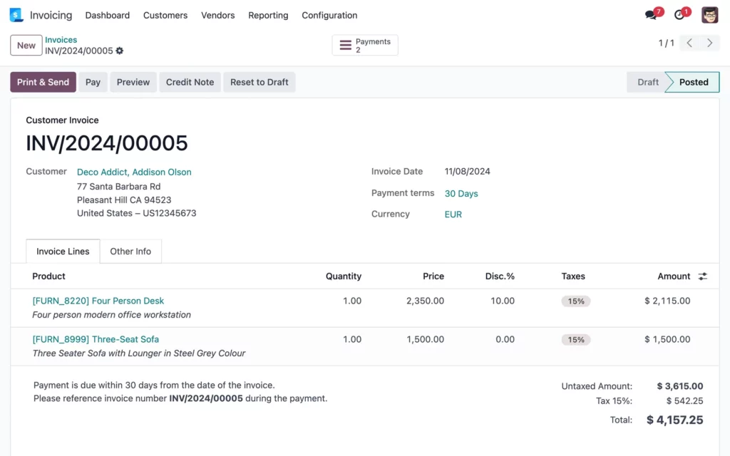 Grâce à Odoo, générez des factures en quelques clics. Tout est automatisé, que ce soit le remplissage des données clients, les positions de la facture ou le taux de TVA qui est appliqué. Des factures récurrentes peuvent être créées, vous n’avez pas besoin de vous prévoir des rappels pour ne rien oublier. Pour le payement, le client peut être redirigé vers le portail de paiement de votre choix ou faire un virement bancaire. La gestion des finances permet d’avoir une vue d’ensemble des factures et de leur statut. Les données des transactions peuvent être saisies automatiquement, et le logiciel permet d’annoter les relevés bancaires.