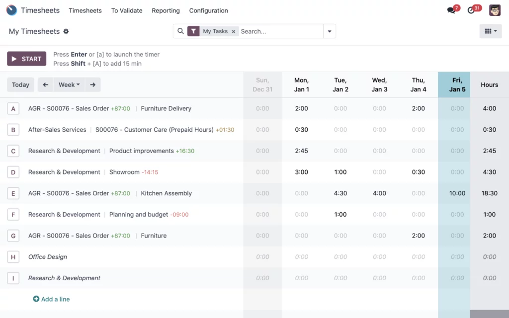 L’interface intuitive et moderne des feuilles de temps Odoo permet à chaque collaborateur de valider les heures qu’il a passé sur un projet mais aussi d’approuver le temps passé sur une tâche. Grâce à ce suivi intelligent du temps, vous avez une vue d’ensemble de l’allocation des heures à chaque tâche et simplifiez ainsi grandement les tâches liées à la facturation. Vous pourrez aussi voir, dans le tableau de bord, quelles sont les tâches les plus chronophages, quels sont les collaborateurs les plus efficaces et bien d’avantages d’informations en fonction de vos besoins.