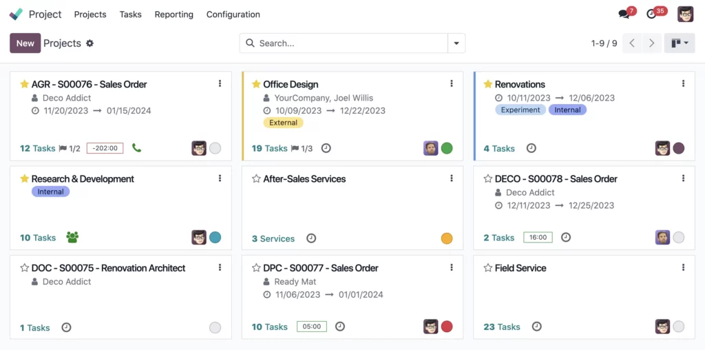 Organisez vos projets grâce à Odoo. Qu’il s’agisse d’allouer des tâches à des collaborateurs, de créer des échéanciers ou des étapes, ou encore de mettre des documents, les différentes vues Kanban et Gantt vous permettent de garder vos objectifs en vue et d’utiliser vos ressources de manière optimale. Obtenez pour chaque projet une facturation en fonction des heures passées dessus, et suivez en temps réel où se trouve chaque projet pour en améliorer la prise en charge.
